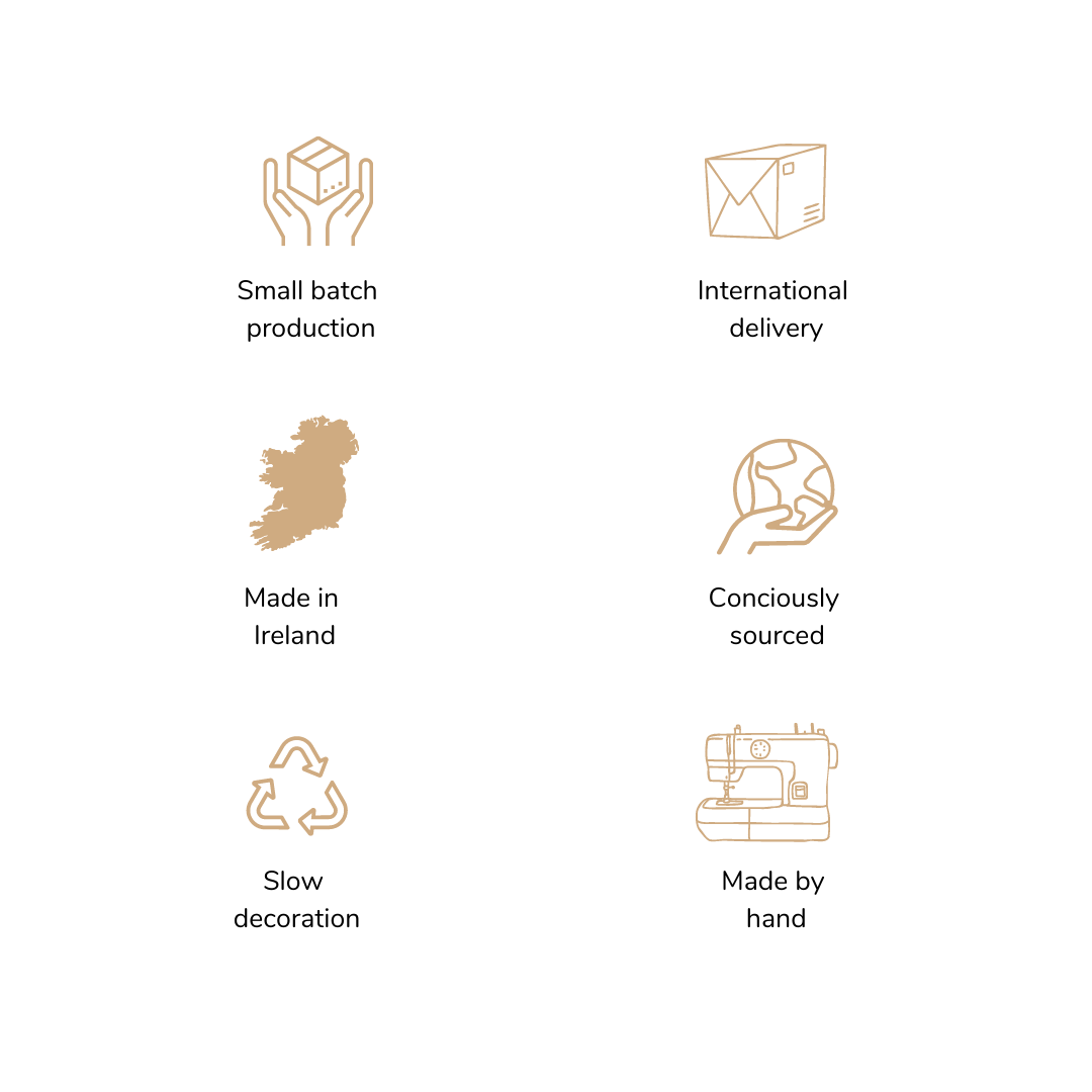 We are committed to providing high-quality products starting with sourced high end designer remnants, handcrafted locally in Ireland.