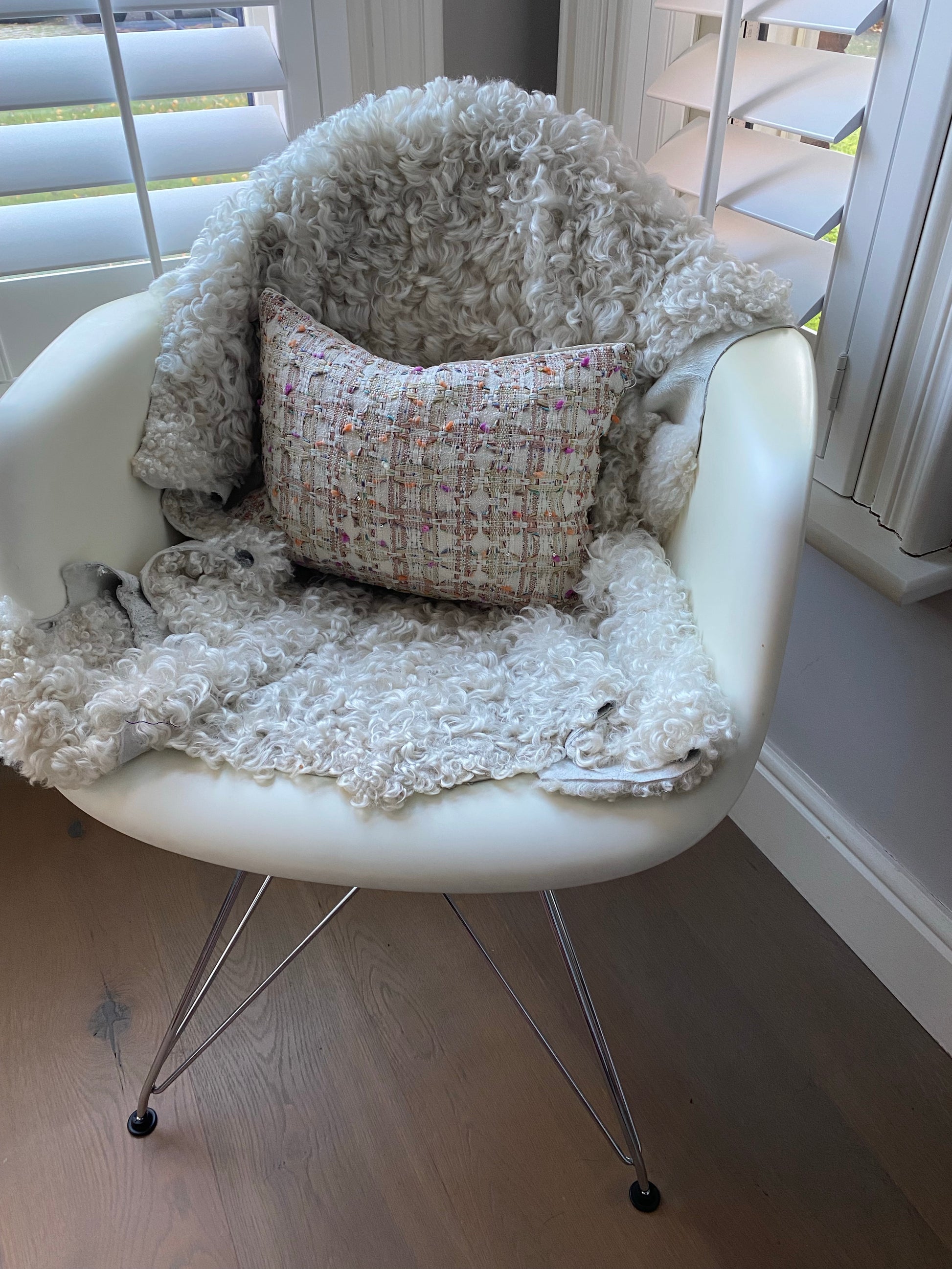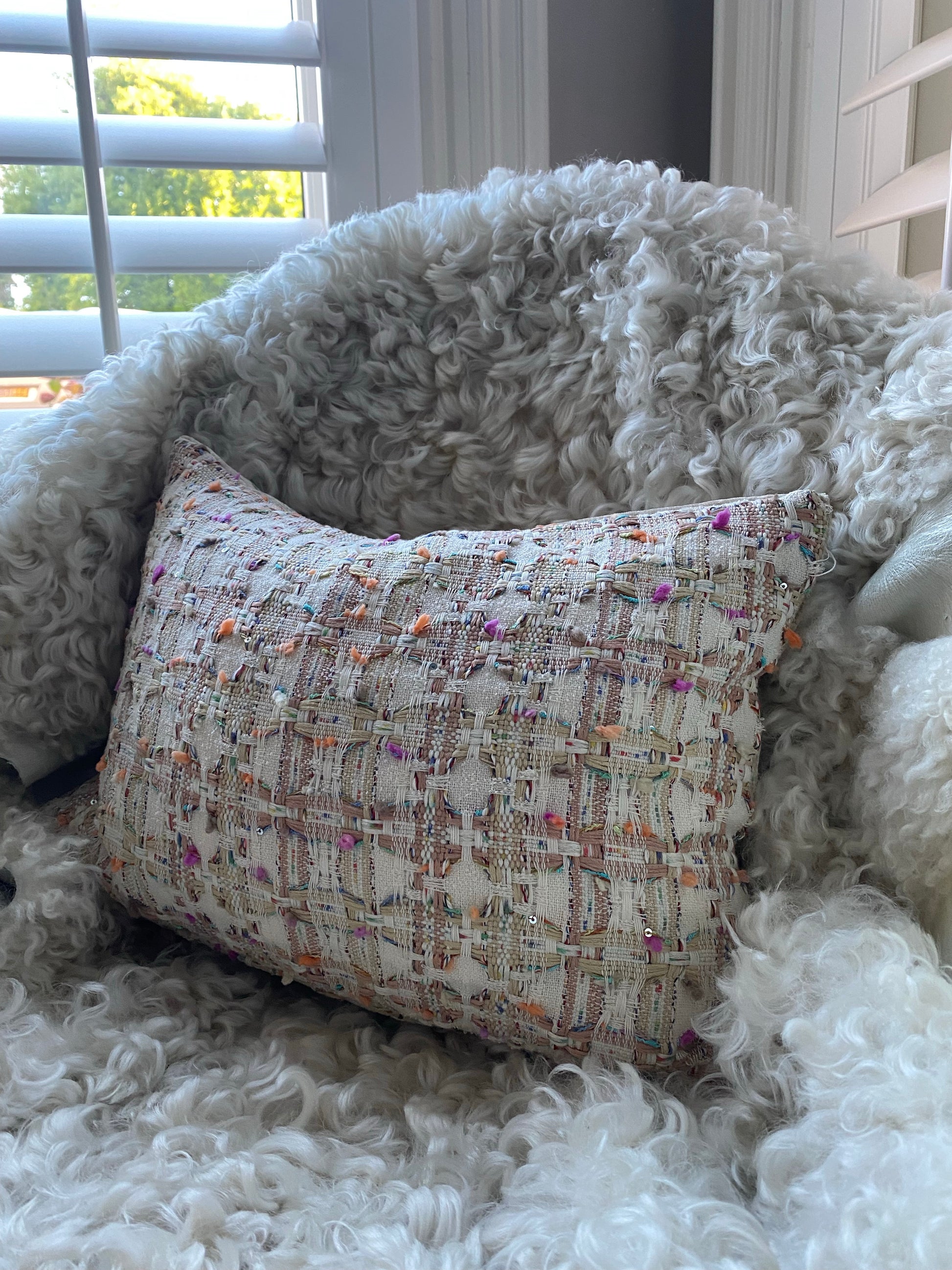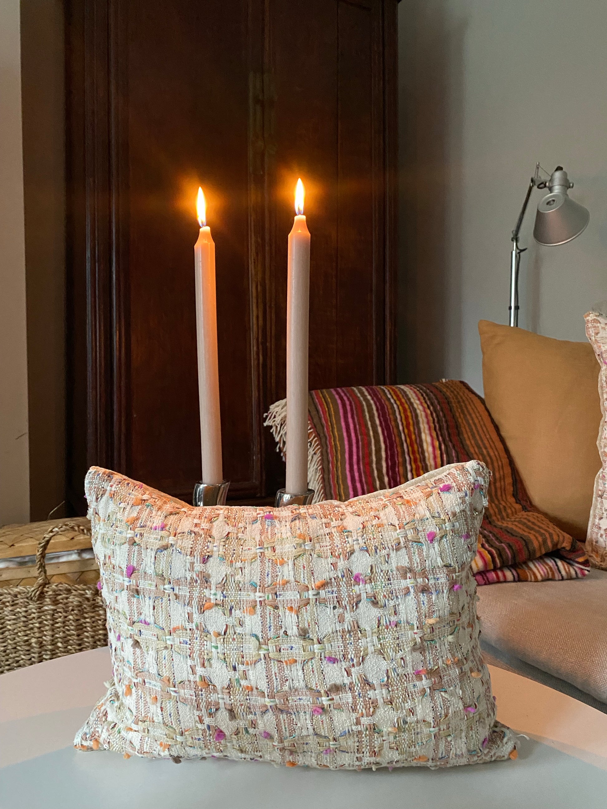 - Cushion with hair loop and invisible asymmetrical closure at the back.